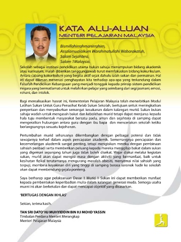 Sekolah sebagai institusi pendidikan utama bukan sahaja menumpukan bidang akademik Saya mengambil kesempatan ini untuk mengucapkan setinggi-tinggi tahniah kepada