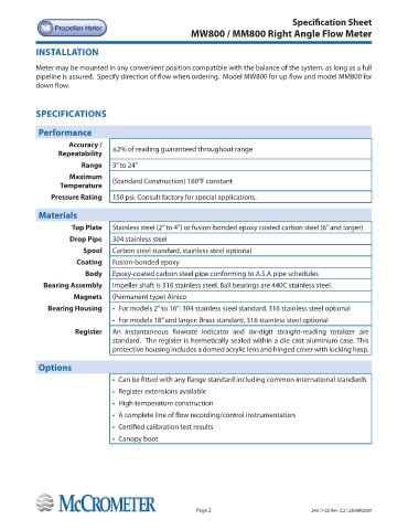 pipeline is assured. Specify direction of flow when ordering. Model MW800 for up flow and model MM800 for