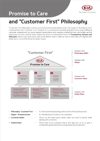 “Customer First” philosophy is at the core of all activities at Kia Motors India. The slogan of “Promise to Care”