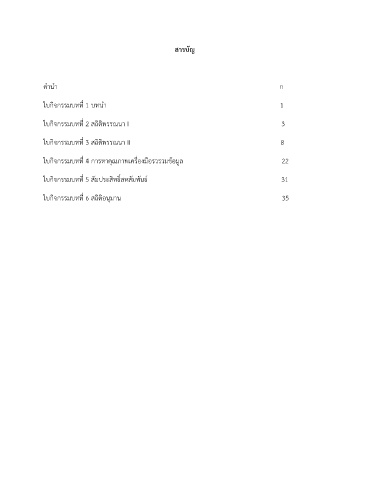 สารบัญ คำนำ ก ใบกิจกรรมบทที่ 1 บทนำ 1 ใบกิจกรรมบทที่ 2 สถิติพรรณนา I 3 ใบกิจกรรมบทที่ 3 สถิติพรรณนา II 8 ใบกิจกรรมบทที่ 4 การหาคุณภาพเครื่องมือรวรวมข้อมูล 22 ใบกิจกรรมบทที่ 5 สัมประสิทธิ์สหสัมพันธ์ 31 ใบกิจกรรมบทที่ 6 สถิติอนุมาน 35