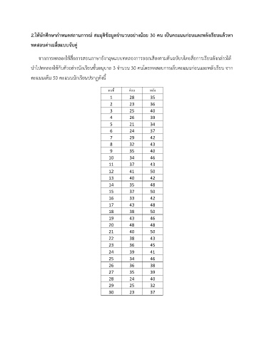 2.ให้นักศึกษากำหนดสถานการณ์ สมมุติข้อมูลจำนวนอย่างน้อย 30 คน เป็นคะแนนก่อนและหลังเรียนแล้วหา