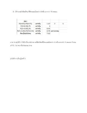 3) มีจำนวนนักเรียนกี่คน ที่มีคะแนนน้อยกว่า 55หรือ มากกว่า 75 คะแนน ภาพ 14 สรุปได้ว่า ถ้ามีนักเรียน 800 คน จะมีนักเรียนที่มีคะแนนน้อยกว่า 55 หรือ มากกว่า 75 คะแนน จำนวน เท่ากับ 7.62 คน หรือประมาณ 8 คน 2.บันทึกการเรียนรู้บทที่ 3