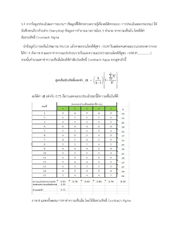 จากนั้นคำนวณหาค่าความเชื่อมั่นโดยใช้ค่าสัมประสิทธิ์ Cronbach Alpla จากสูตรดังนี้