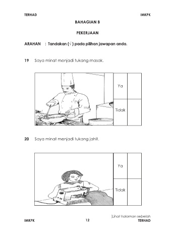 TERHAD IMKPK BAHAGIAN B PEKERJAAN ARAHAN : Tandakan (√ ) pada pilihan jawapan anda. 19 Saya minat menjadi tukang masak. Ya Tidak 20 Saya minat menjadi tukang jahit. Ya Tidak [Lihat halaman sebelah IMKPK 12 TERHAD