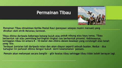 Pemainan Tibau dimainkan Ketika Pestal Kaul (perayaan selepas musim menuai) yang