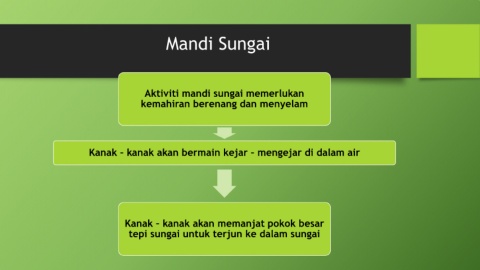 Mandi Sungai Aktiviti mandi sungai memerlukan kemahiran berenang dan menyelam Kanak – kanak akan bermain kejar – mengejar di dalam air Kanak – kanak akan memanjat pokok besar tepi sungai untuk terjun ke dalam sungai