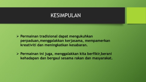 KESIMPULAN ➢ Permainan tradisional dapat mengukuhkan perpaduan,menggalakkan kerjasama, mempamerkan kreativiti dan meningkatkan kesabaran. ➢ Permainan ini juga, menggalakkan kita berfikir,berani kehadapan dan bergaul sesama rakan dan masyarakat.