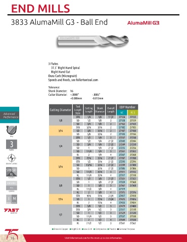 END MILLS 3833 AlumaMill G3 - Ball End Advanced Performance UNCOATED FC-5 I M IMPERIAL METRIC ■ Brass & Copper ■ High Si Al ■ Low Si Al ■ Composites ■ Plastics ■ General Purpose 16