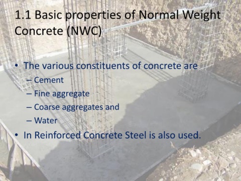 1.1 Basic properties of Normal Weight Concrete (NWC) • The various constituents of concrete are – Cement – Fine aggregate – Coarse aggregates and – Water • In Reinforced Concrete Steel is also used.