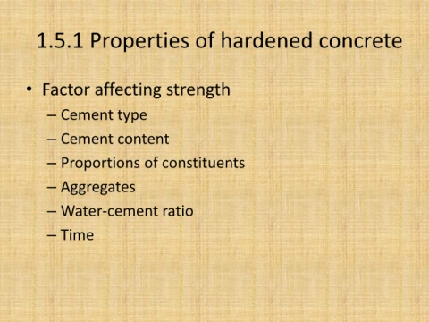1.5.1 Properties of hardened concrete • Factor affecting strength – Cement type – Cement content – Proportions of constituents – Aggregates – Water-cement ratio – Time