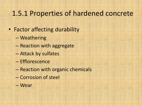 1.5.1 Properties of hardened concrete • Factor affecting durability – Weathering – Reaction with aggregate – Attack by sulfates – Efflorescence – Reaction with organic chemicals – Corrosion of steel – Wear