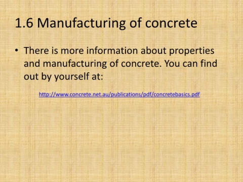 1.6 Manufacturing of concrete • There is more information about properties and manufacturing of concrete. You can find out by yourself at: http://www.concrete.net.au/publications/pdf/concretebasics.pdf