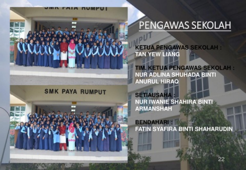 PENGAWAS SEKOLAH KETUA PENGAWAS SEKOLAH : TAN YEW LIANG TIM. KETUA PENGAWAS SEKOLAH : NUR ADLINA SHUHADA BINTI ANURUL HIRAQ SETIAUSAHA : NUR IWANIE SHAHIRA BINTI ARMANSHAH BENDAHARI : FATIN SYAFIRA BINTI SHAHARUDIN 22