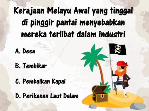 Kerajaan Melayu Awal yang tinggal di pinggir pantai menyebabkan mereka terlibat dalam industri A. Desa B. Tembikar C. Pembaikan Kapal D. Perikanan Laut Dalam