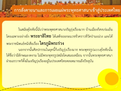 ในสมัยสุโขทัยนี้นับว่าพระพุทธศาสนาเจริญรุ่งเรืองมาก บ้านเมืองก็สงบร่มเย็น