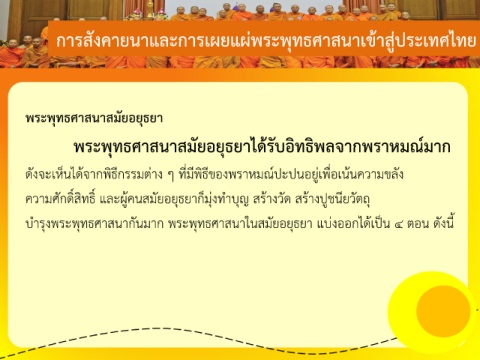 บ ารุงพระพุทธศาสนากันมาก พระพุทธศาสนาในสมัยอยุธยา แบ่งออกได้เป็น ๔ ตอน ดังนี้