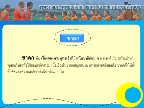 ชาดก ชาดก คือ เรื่องของพระพุทธเจ้าที่มีมาในชาติก่อน ๆ พระองค์น ามาตรัสเล่าแก่ พุทธบริษัทเพื่อใช้สอนหลักธรรม เนื้อเรื่องในชาดกสนุกสนาน แทรกด้วยคติสอนใจ ชาดกจึงให้ทั้ง ข้อคิดและความเพลิดเพลินไปพร้อม ๆ กัน