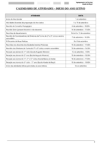 CALENDÁRIO DE ATIVIDADES – INÍCIO DO ANO LETIVO