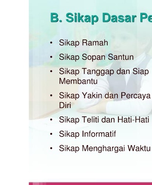 B. Sikap Dasar Pe • Sikap Ramah • Sikap Sopan Santun • Sikap Tanggap dan Siap Membantu • Sikap Yakin dan Percaya Diri • Sikap Teliti dan Hati-Hati • Sikap Informatif • Sikap Menghargai Waktu