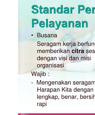 Standar Pen Pelayanan • Busana Seragam kerja berfung memberikan citra ses dengan visi dan misi organisasi Wajib : - Mengenakan seragam Harapan Kita dengan lengkap, benar, bersih rapi