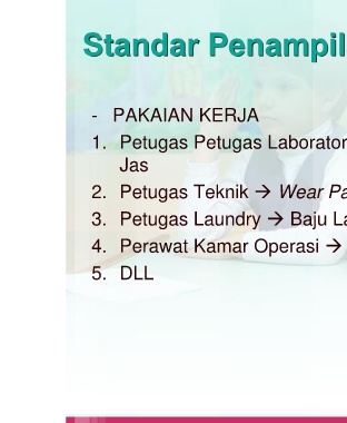 Standar Penampila - PAKAIAN KERJA 1. Petugas Petugas Laborator Jas 2. Petugas Teknik ? Wear Pa 3. Petugas Laundry ? Baju La 4. Perawat Kamar Operasi ? 5. DLL