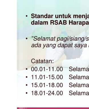 • Standar untuk menja dalam RSAB Harapa • ”Selamat pagi/siang/so ada yang dapat saya b Catatan: Selama • 00.01-11.00 Selama • 11.01-15.00 Selama • 15.01-18.00 Selama • 18.01-24.00