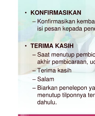 • KONFIRMASIKAN – Konfirmasikan kembal isi pesan kepada pene • TERIMA KASIH – Saat menutup pembic akhir pembicaraan, uc – Terima kasih – Salam – Biarkan penelepon ya menutup tilponnya terl dahulu.