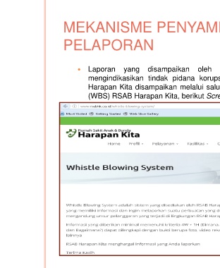 MEKANISME PENYAMP PELAPORAN ? Laporan yang disampaikan oleh mengindikasikan tindak pidana korups Harapan Kita disampaikan melalui salu (WBS) RSAB Harapan Kita, berikut Scre