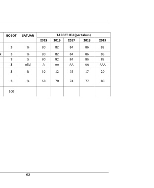BOBOT SATUAN TARGET IKU (per tahun) 3 % 2015 2016 2017 2018 2019 k3 % 88 % 80 82 84 86 88 3 nilai 88 3 % 80 82 84 86 AAA 3 80 82 84 86 20 A AA AA AA 80 10 12 15 17 3 % 68 70 74 77 100 63