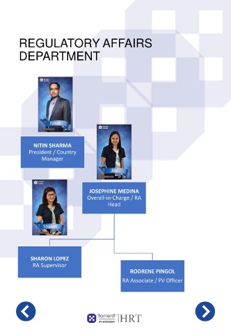 REGULATORY AFFAIRS DEPARTMENT NITIN SHARMA President / Country Manager JOSEPHINE MEDINA Overall-in-Charge / RA Head SHARON LOPEZ RA Supervisor RODRENE PINGOL RA Associate / PV Officer