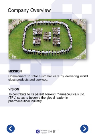 Company Overview MISSION Commitment to total customer care by delivering world class products and services. VISION To contribute to its parent Torrent Pharmaceuticals Ltd. (TPL) so as to become the global leader in pharmaceutical industry.