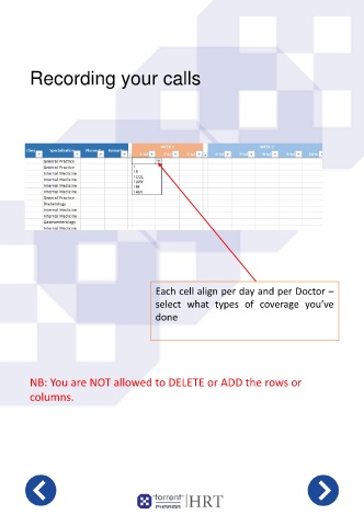 Recording your calls Each cell align per day and per Doctor – select what types of coverage you’ve done NB: You are NOT allowed to DELETE or ADD the rows or columns.