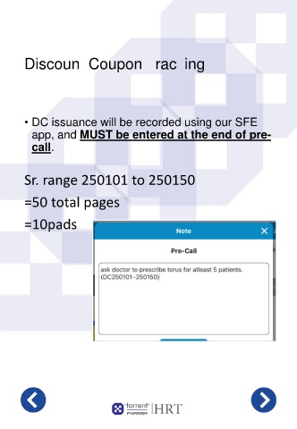 Discount Coupon Tracking • DC issuance will be recorded using our SFE app, and MUST be entered at the end of pre- call. Sr. range 250101 to 250150 =50 total pages =10pads