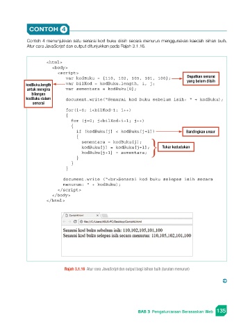 Rajah 3.1.16 Atur cara JavaScript dan output bagi isihan buih (turutan menurun)
