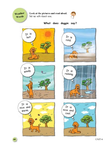 Weather Look at the pictures and read aloud. Words {MÌo nhm Am{U ‘moR>çmZo dmMm. What does doggie say ? It is hot. It is cold. It is windy. It is raining. It is nice and It is warm. nice and cool. 60 UNIT 4