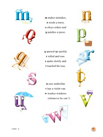 m makes mistakes, n needs a nurse. o obeys orders and p patches a purse. q queued up quickly r rolled and rose. s spoke slowly and t touched his toes. u uses umbrellas v has a violet van. w washes windows (whenever he can !) UNIT 6 77