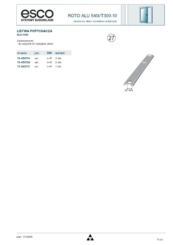 ROTO ALU 540i/T300-10 okucia do okien rozwierno-uchylnych LISTWA POPYCHACZA ALU 540i Zastosowanie: - do wszystkich rodzajów okien nr esco j.m. DIN wariant 70-859710 szt. L+R 3 mb. 70-859729 szt. L+R 2 mb. 70-859737 szt. L+R 1 mb. stan: 11/2009 70.84
