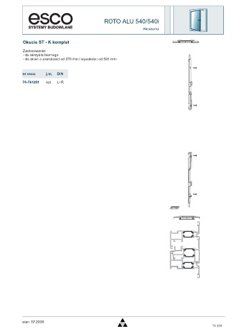 ROTO ALU 540/540i Akcesoria Okucie ST - K komplet Zastosowanie: - do skrzydła biernego - do okien o szerokości od 370 mm i wysokości od 591 mm nr esco j.m. DIN 70-761281 szt. L+R stan: 07.2008 70.108