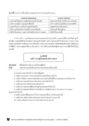 จากตารางท 1.1 สรปข้อแตกตางระหวางการตลาดกบการขายได้วา การตลาดใหความสาคญกบลกคา