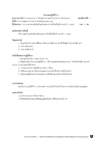 2. ให้ผเรียนจดทากิจกรรมปฎิบัตที 3.1 เรื่องกลยุทธ์ผลตภัณฑ์และตลาด โดยใช้เครองมอ Ansoff’s