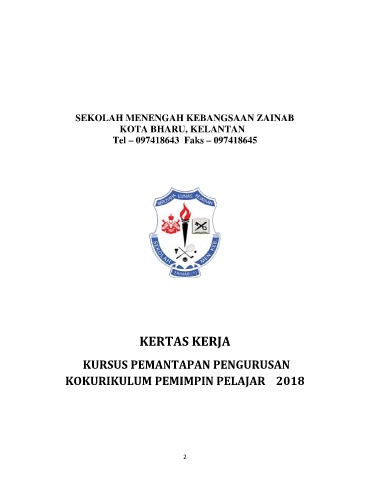 SEKOLAH MENENGAH KEBANGSAAN ZAINAB KOTA BHARU, KELANTAN Tel – 097418643 Faks – 097418645 KERTAS KERJA KURSUS PEMANTAPAN PENGURUSAN KOKURIKULUM PEMIMPIN PELAJAR 2018 2
