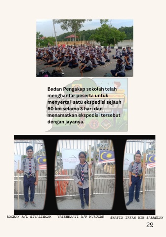 Badan Pengakap sekolah telah menghantar peserta untuk menyertai satu ekspedisi sejauh 60 km selama 3 hari dan menamatkan ekspedisi tersebut dengan jayanya. ROGHAN A/L SIVALINGAM VAISHNAAVI A/P MURUGAN SHAFIQ IRFAN BIN SARASLAN 29
