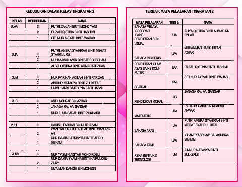 KEDUDUKAN DALAM KELAS TINGKATAN 2 TERBAIK MATA PELAJARAN TINGKATAN 2