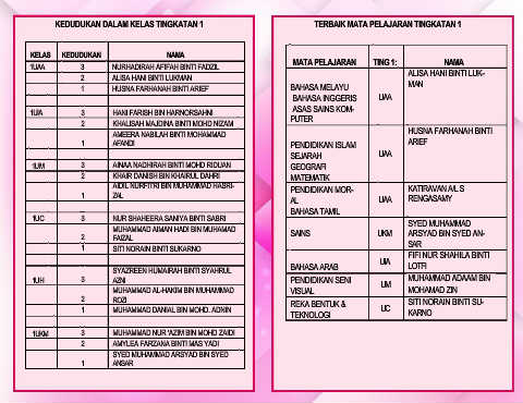 KEDUDUKAN DALAM KELAS TINGKATAN 1 TERBAIK MATA PELAJARAN TINGKATAN 1