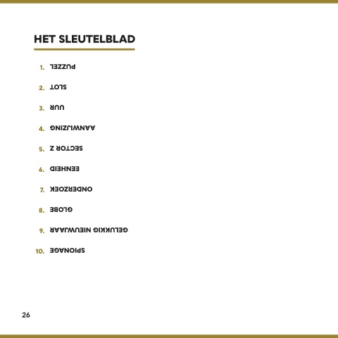 HET SLEUTELBLAD 1. PUZZEL 2. SLOT 3. UUR 4. AANWIJZING 5. SECTOR Z 6. EENHEID 7. ONDERZOEK 8. GLOBE 9. GELUKKIG NIEUWJAAR KORTRIJK Doorniksestraat 44 10. SPIONAGE GENT Dok-Noord 3C Stapelplein 70 bus 302 info@lockdown-escape.be 0468 05 92 45 26