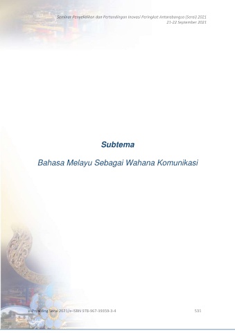Seminar Penyelidikan dan Pertandingan Inovasi Peringkat Antarabangsa (Serai) 2021 21-22 September 2021 Subtema Bahasa Melayu Sebagai Wahana Komunikasi e-Prosiding Serai 2021/e-ISBN 978-967-19359-3-4 531