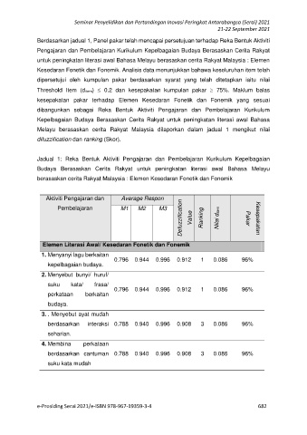 Berdasarkan jadual 1, Panel pakar telah mencapai persetujuan terhadap Reka Bentuk Aktiviti