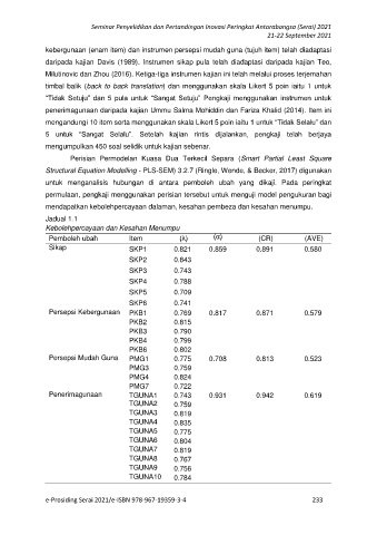 kebergunaan (enam item) dan instrumen persepsi mudah guna (tujuh item) telah diadaptasi