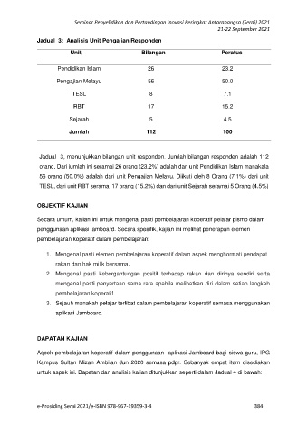 Jadual 3, menunjukkan bilangan unit responden. Jumlah bilangan responden adalah 112