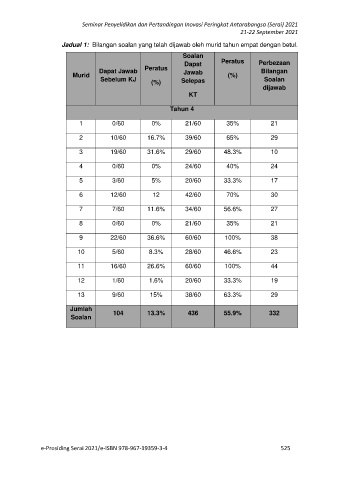 Jadual 1: Bilangan soalan yang telah dijawab oleh murid tahun empat dengan betul.